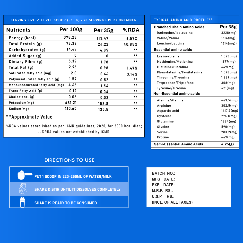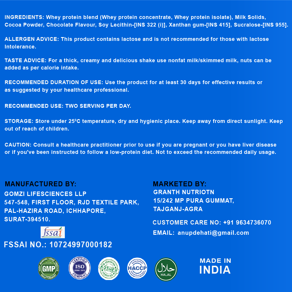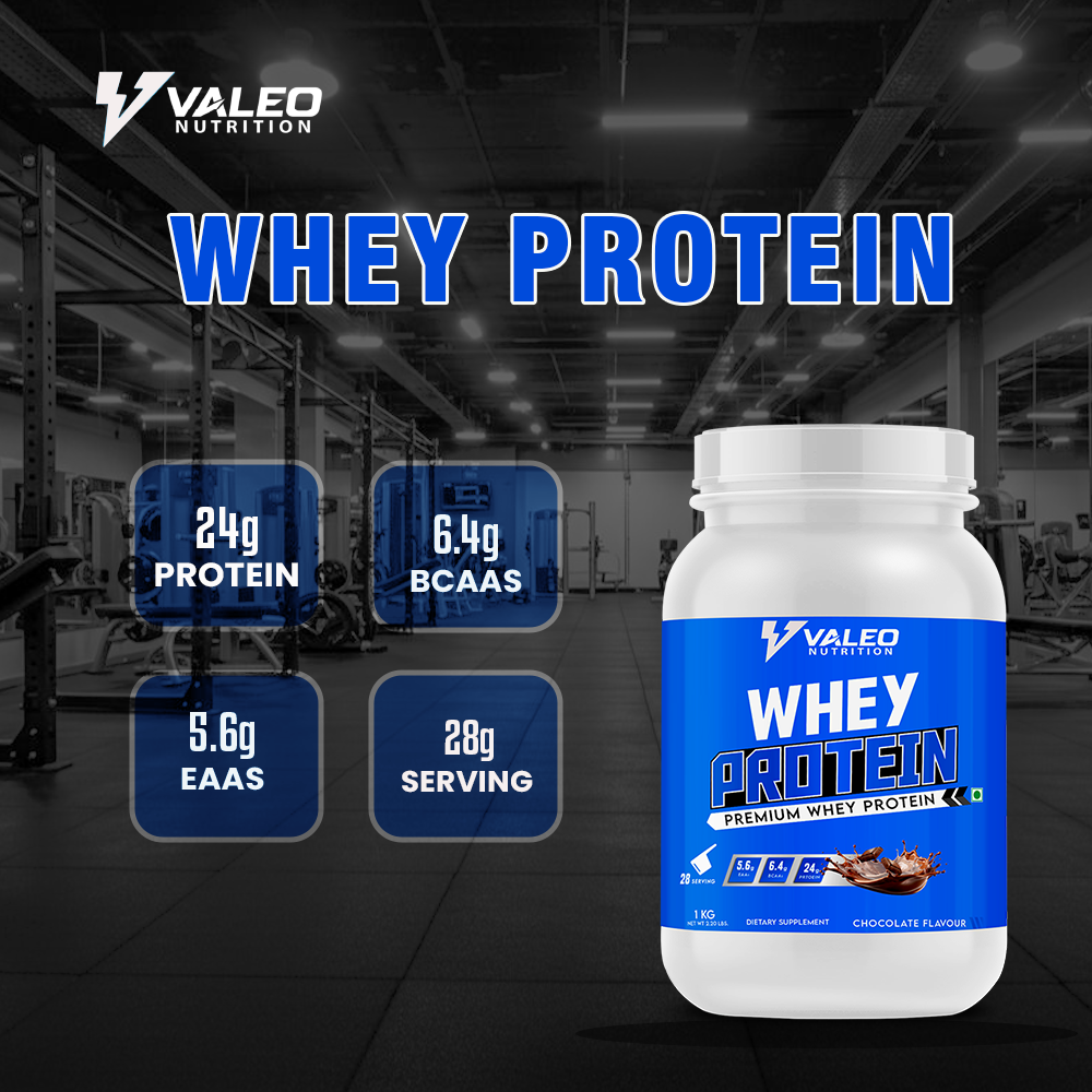 VALEO Nutrition Whey Protein chocolate is a Mixture of Whey Isolate, Whey Concentrate, Skimmed Milk powder, Soy protein isolate and plant protein. It is packed with 24g of 100% High Quality whey protein chocolate per serving (30g scoop). The benchmark and premium source of protein powders.